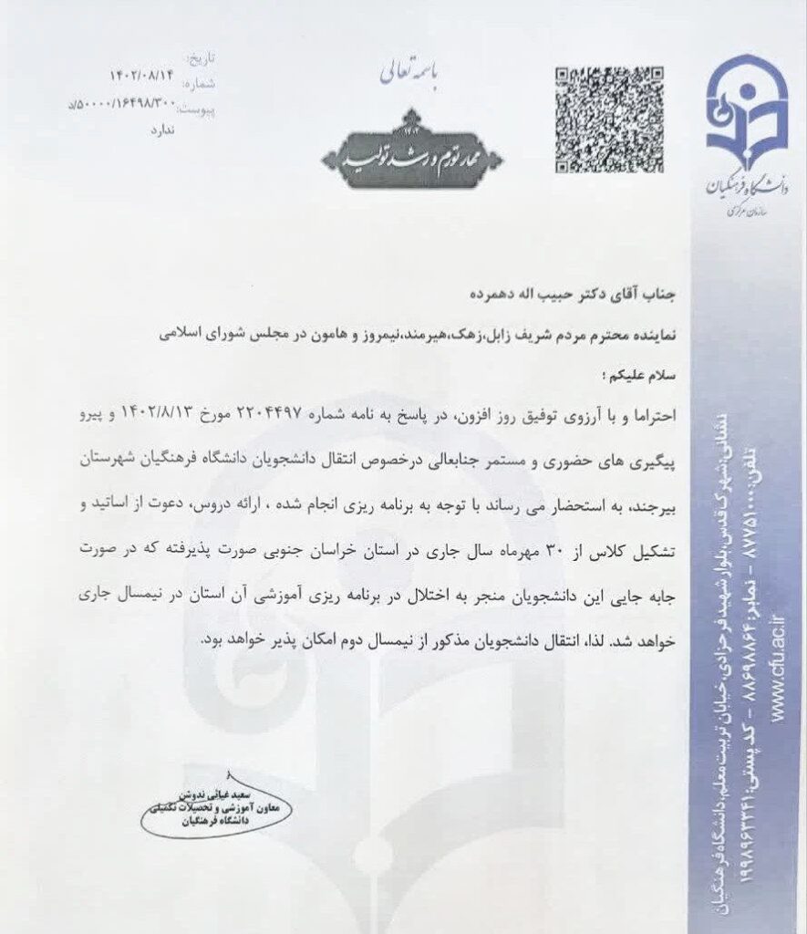 پاسخ غیاثی ندوشن معاون آموزشی دانشگاه فرهنگیان کشور، به درخواست دهمرده نماینده مردم سیستان در خصوص انتقال دانشجویان بومی استان از خراسان جنوبی به سیستان و بلوچستان.