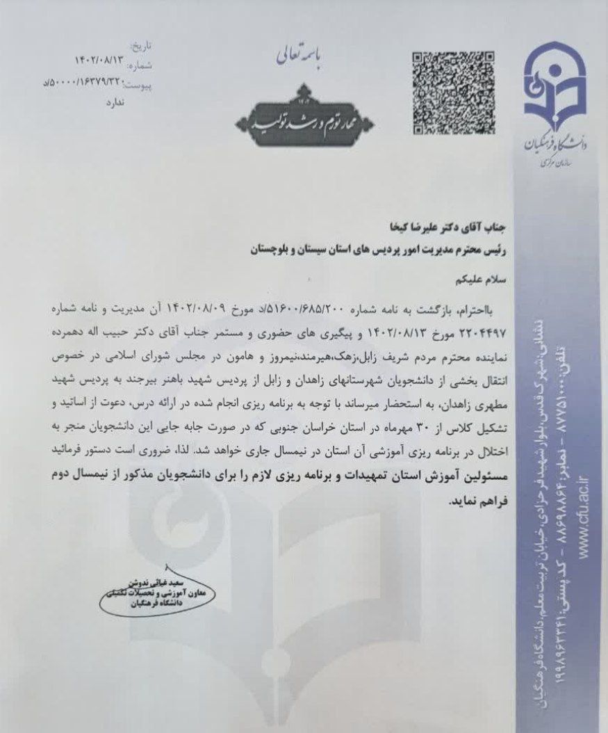 نامه غیاثی ندوشن معاون آموزشی دانشگاه فرهنگیان، به مدیریت امور پردیس های استان سیستان و بلوچستان، پیرو پی گیری های دهمرده نماینده مردم سیستان، در خصوص انتقال دانشجویان بومی استان از خراسان جنوبی به سیستان و بلوچستان.