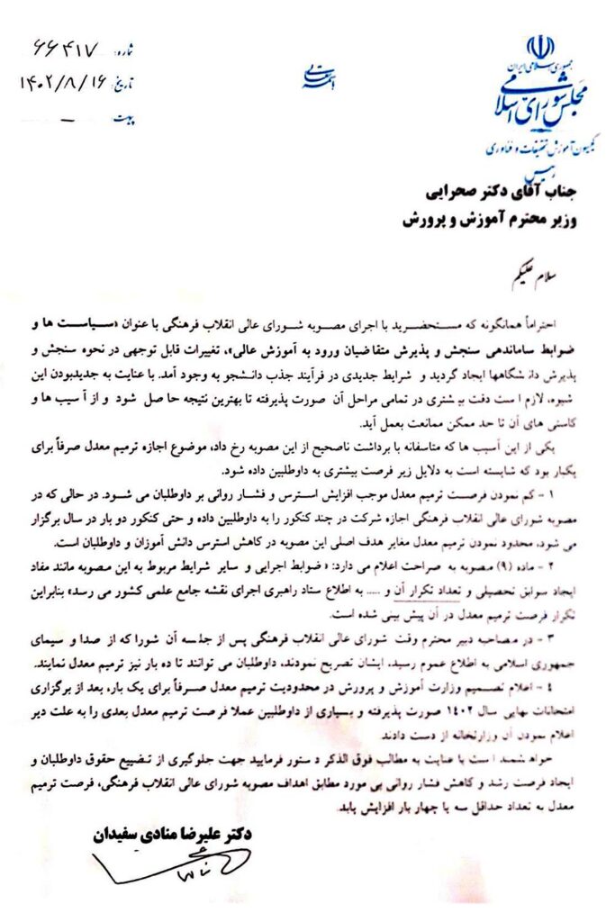 آوای فرهنگی – رئیس کمیسیون آموزش، تحقیقات و فناوری مجلس در نامهای خطاب به وزیر آموزش و پرورش با ذکر ۴ دلیل، خواستار برگزاری حداقل سه یا چهار مرتبه آزمون ترمیم معدل برای داوطلبان کنکور شد.