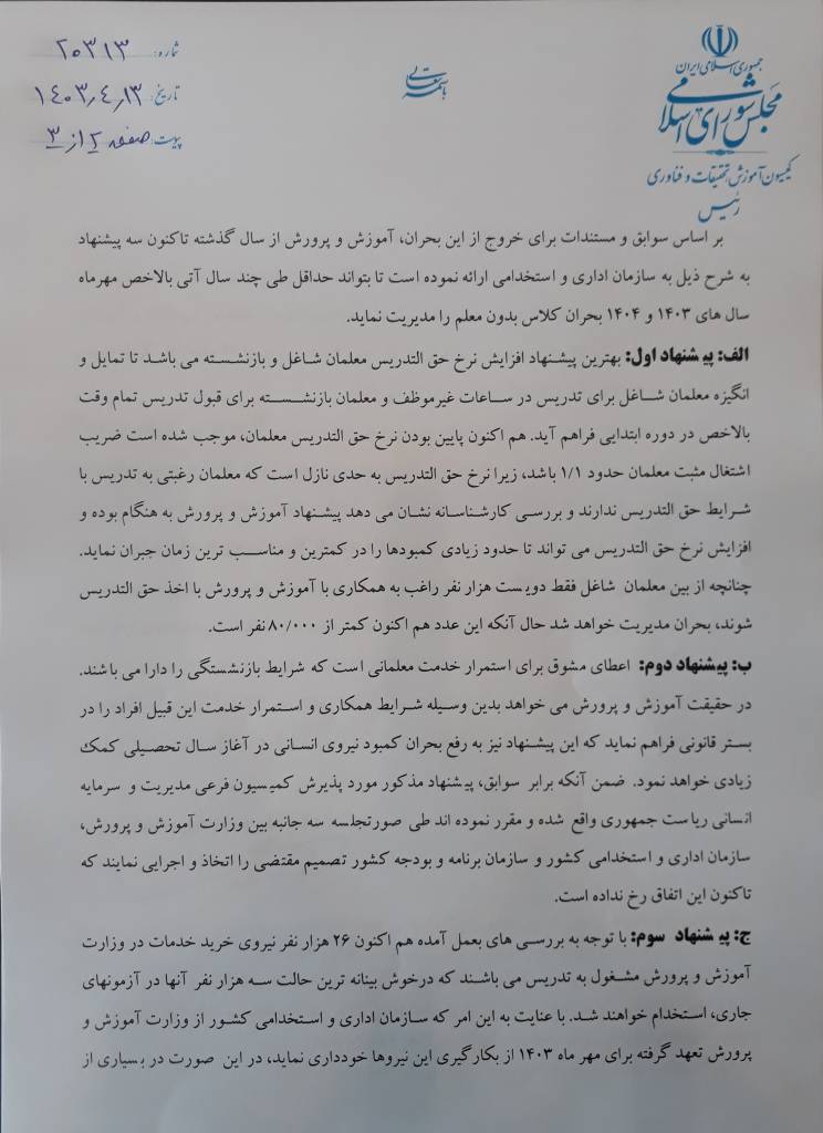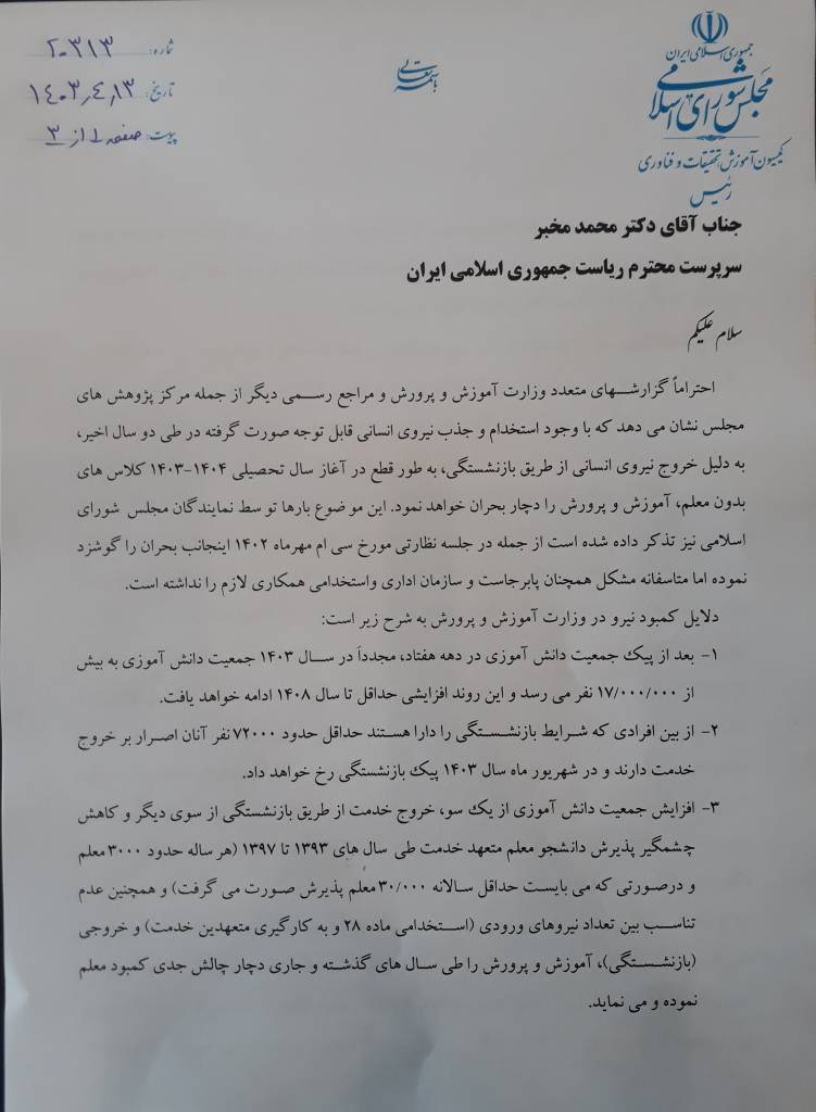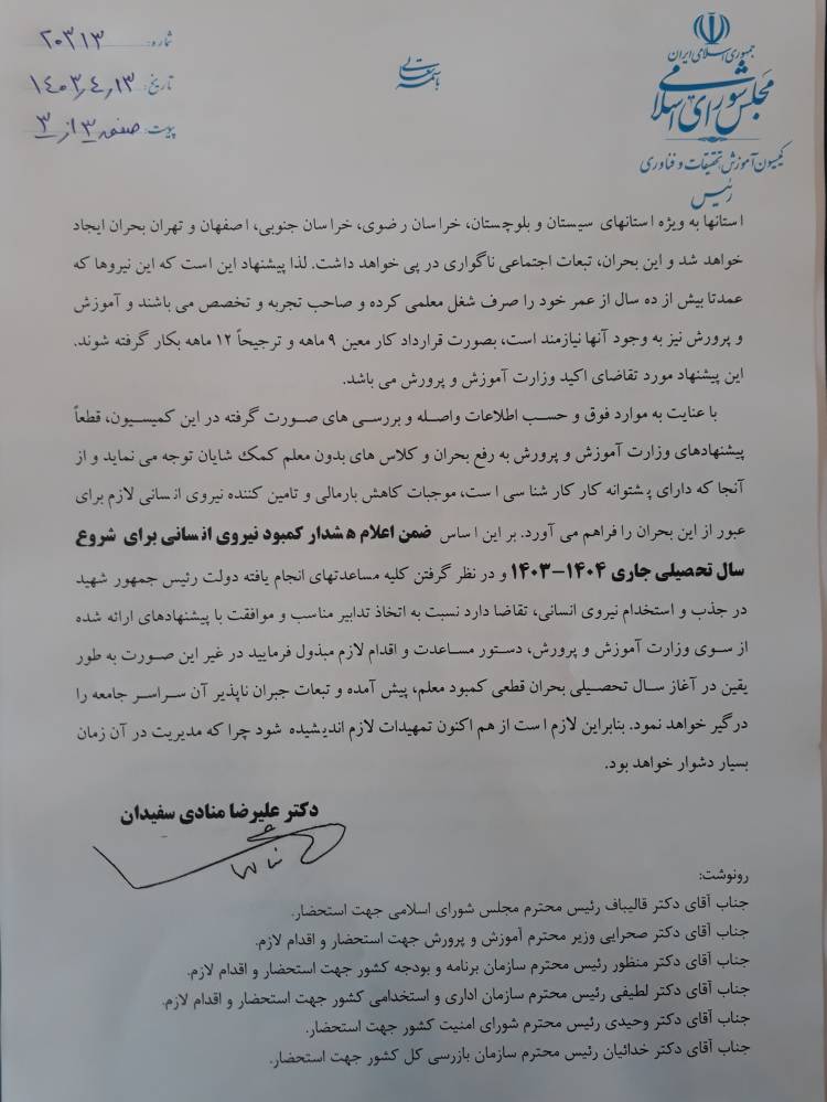 با عنایت به موارد فوق و حسب اطلاعات واصله و بررسیهای صورت گرفته در این کمیسیون قطعاً پیشنهادهای وزارت آموزش و پرورش به رفع بحران و کلاسهای بدون معلم کمک شایان توجه می نماید و از آنجا که دارای پشتوانه کار کارشناسی است موجبات کاهش بار مالی و تامین کننده نیروی انسانی لازم برای عبور از این بحران را فراهم می آورد بر این اساس ضمن اعلام هشدار کمبود نیروی انسانی برای شروع سال تحصیلی جاری ۱۴۰۴-۱۴۰۳ و در نظر گرفتن کلیه مساعدتهای انجام یافته دولت رئیس جمهور شهید در جذب و استخدام نیروی انسانی تقاضا دارد نسبت به اتخاذ تدابیر مناسب و موافقت با پیشنهادهای ارائه شده از سوی وزارت آموزش و پرورش دستور مساعدت و اقدام لازم مبذول فرمایید در غیر این صورت به طور یقین در آغاز سال تحصیلی بحران قطعی کمبود معلم پیش آمده و تبعات جبران ناپذیر آن سراسر جامعه را درگیر خواهد نمود. بنابراین لازم است از هم اکنون تمهیدات لازم اندیشیده شود چرا که مدیریت در آن زمان بسیار دشوار خواهد بود.