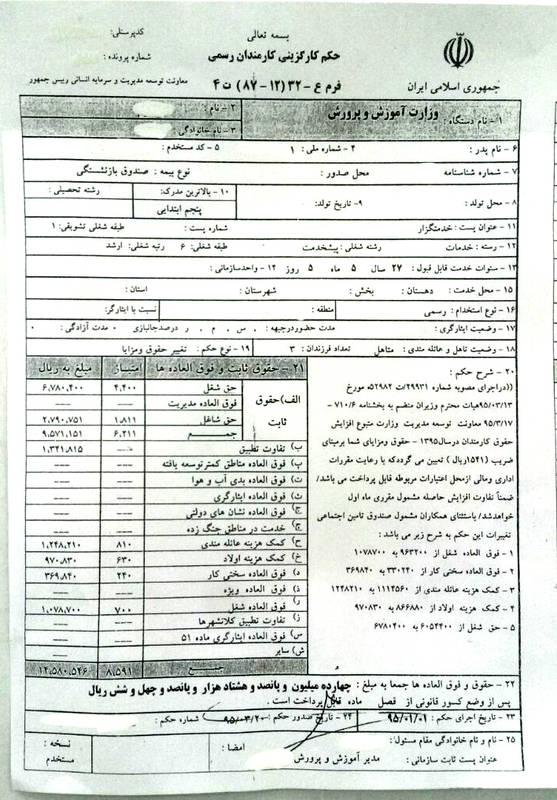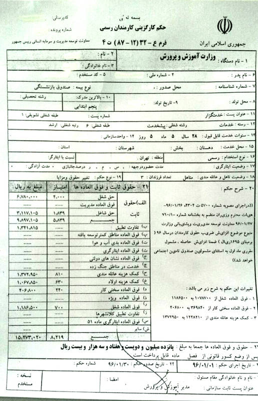 نمونه فیش حقوقی یکی از پرسنل آموزش و پرورش با ۲۸ سال سابقه کار