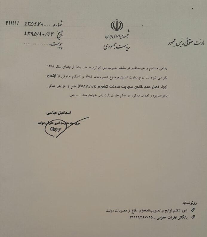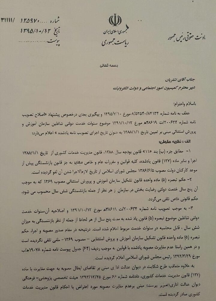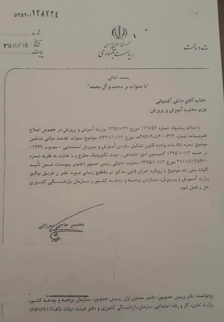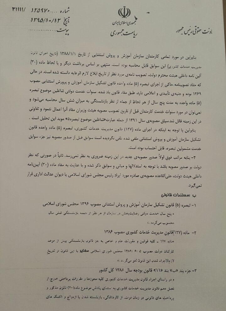 به رغم در بوق وکرنا شدن خدمات دولت در بخش آموزش وپرورش وپرداخت برخی مطالبات وتمهیدات لازم برای پرداخت سایر مطالبات معوق آموزش وپرورش ،نه جناب دکتر آشتیانی ونه معاونان منتصب ایشان ، از جمله معاونت محترم پشتیبانی جناب آقای فرزانه حتی یک بار به مطالبات معلمان این حوزه که در سخت ترین شرایط کار می کنند ومجموع مطالبات ناشی از اعمال ضریب ۱/۲ مربوط به ضوابط اجرائی تبصره ۵ ماده واحده قانون تشکیل سازمان آموزش وپرورش استثنائی کشور، در حقوق ومزایای مستمر افراد ،که به نظر مبلغی حدود ۳۰۰میلیارد تومان می باشد ،واز قضا دارای رای عمومی دیوان عدالت اداری (اینجا)،که در آن آموزش وپرورش محکوم وملزم به پرداخت حقوق ناشی از قانون فوق گردیده است ،اشاره ای ننموده وموضع سکوت رابرگزیده اند،ومعاونت حقونی ریاست جمهوری نیز در سال ۹۵ با ابلاغ قانونی بودن این خواسته ،از وزیر آموزش وپرورش خواسته بودند با هماهنگی با سازمان برنامه وبودجه نسبت به اعمال رای دیوان وپرداخت طلب همکاران اقدام نمایند که تاکنون هیچ اقدامی صورت نگرفته است .تصویر مکاتبات معاوتن حقوقی با وزیرآموزش وپرورش
